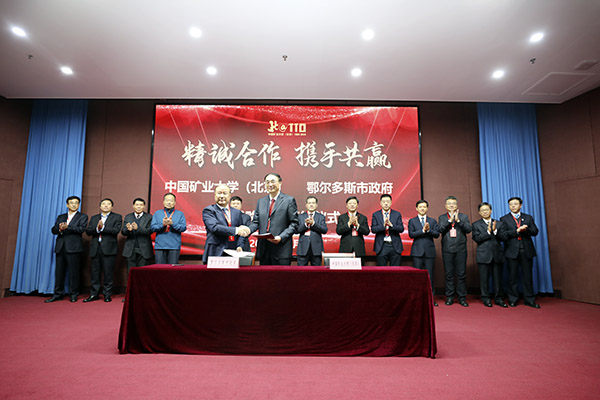 在热烈的掌声中,校长葛世荣同鄂尔多斯市委副书记、市长斯琴毕力格共同签署校地战略合作协议。双方将在科学研究、成果转化、产业创新、人才培养、城市建设和战略咨询等诸多领域,深入开展深度合作。