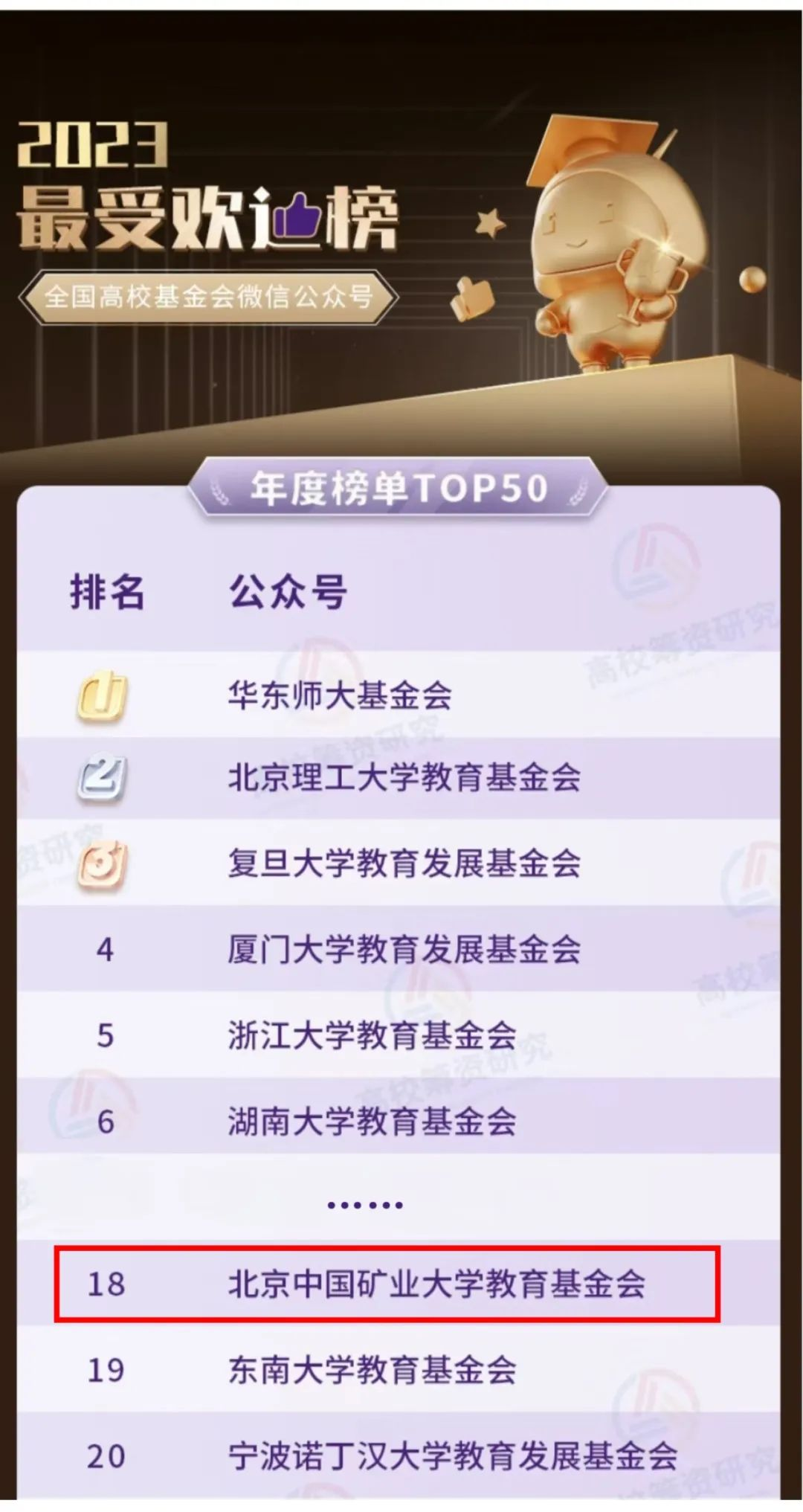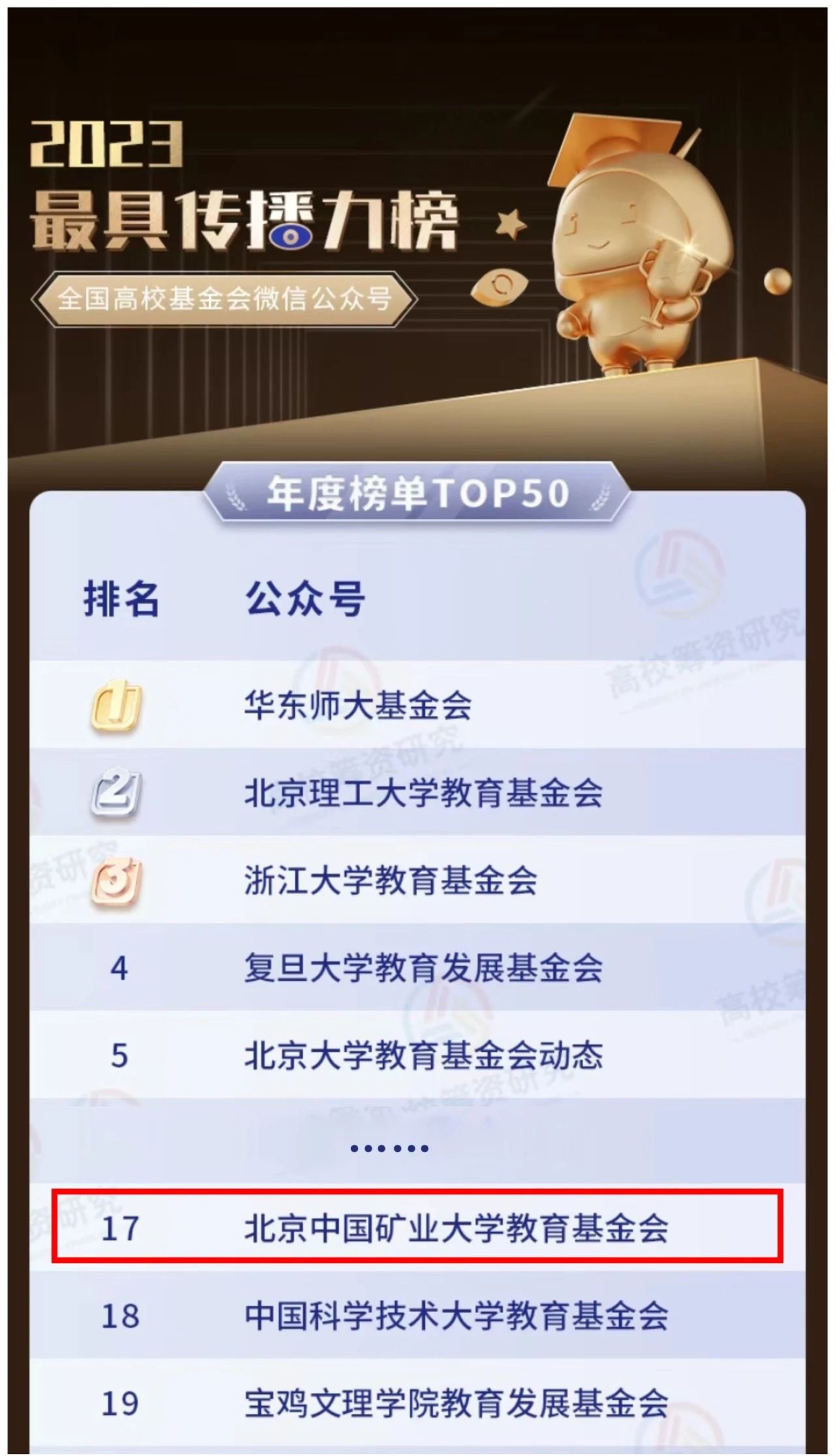 根据蓝矩高校筹资研究发布的“2023高校基金会微信公众号50强榜”,北京中国矿业大学教育基金会微信公众号在“2023最具传播力榜”中位列第17名,在“最受欢迎榜”中位列第18名。这是公众号首次入榜前二十,既是对2023年基金会工作的认可,也是对2024年工作的鞭策!